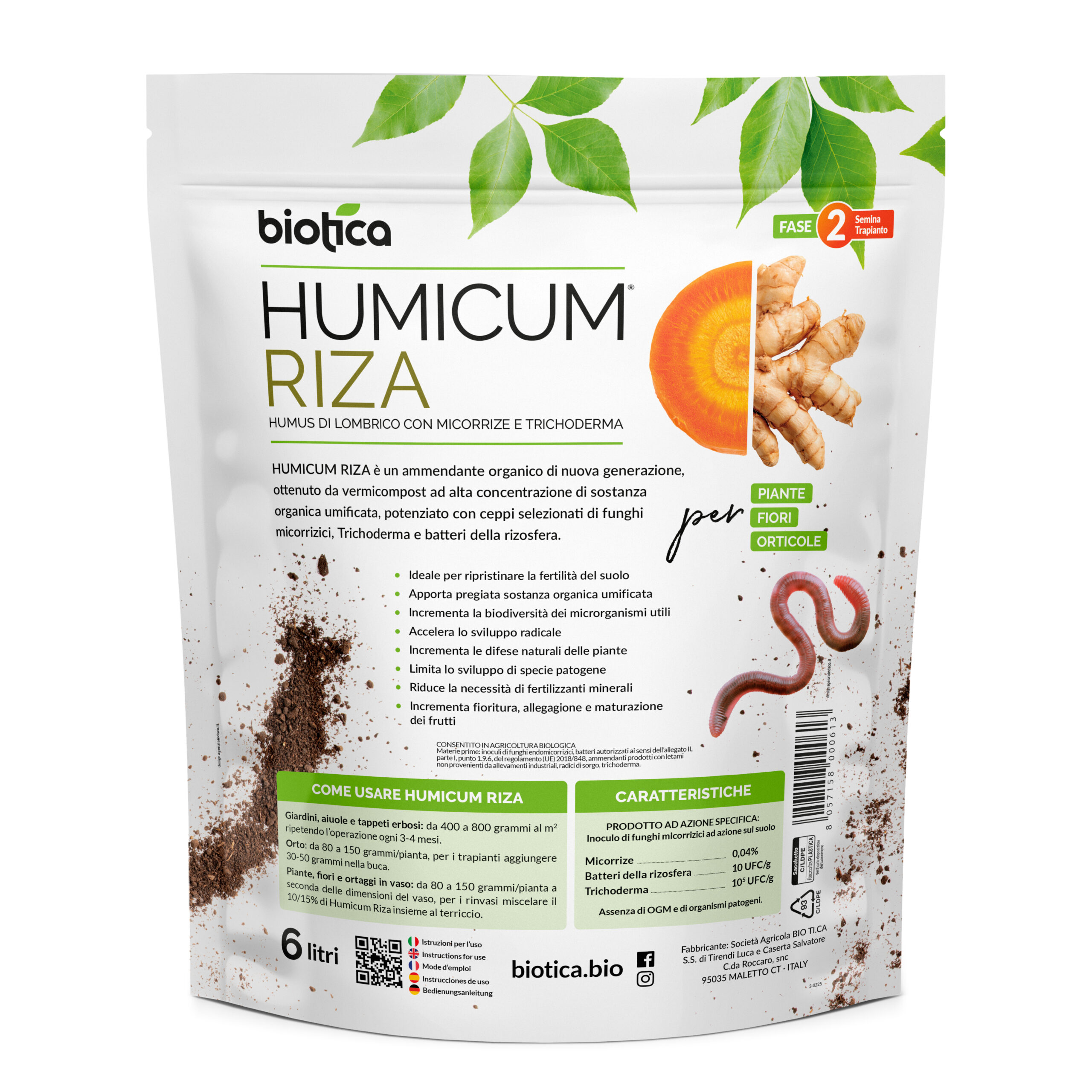- AMMENDANTE ORGANICO DI NUOVA GENERAZIONE: Humicum Riza è ottenuto da vermicompost ad elevata concentrazione di sostanza organica umificata ed è arricchito con ceppi selezionati di micorrize, Trichoderma e batteri della rizosfera, per un’azione completa sul terreno e sulle piante.